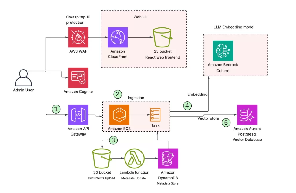 - Amazon ECS (Docker-based containers) handles document ingestion, preprocessing, and embedding workflows.